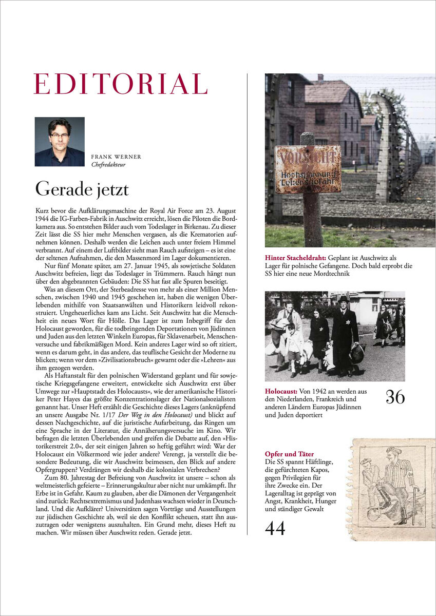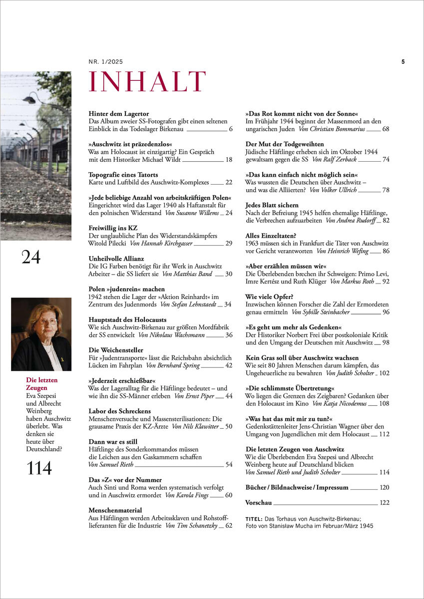Diese Ausgabe beleuchtet die Geschichte von Auschwitz, die juristische Aufarbeitung, die Annäherungsversuche im Kino sowie die aktuellen Debatten über den Holocaust und seine Bedeutung. Zum 80. Jahrestag der Befreiung von Auschwitz erinnern wir daran, wie wichtig es ist, die Erinnerungskultur zu bewahren, gerade angesichts wachsender rechtsextremer und antisemitischer Tendenzen. Wir müssen über Auschwitz reden. Gerade jetzt.